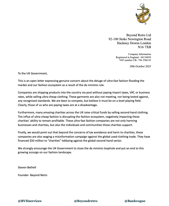 Calling the situation a “growing scourge on our fashion landscape,” Bethell urges the Government to close the de minimis loophole as a matter of urgency. Signed in his capacity as founder of Beyond Retro, the appeal underscores the wider concerns of circular fashion advocates who argue that unchecked imports of ultra-fast fashion threaten sustainability efforts, economic fairness and community support structures alike.