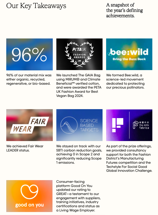 Material innovation remained central to PANGAIA’s strategy in 2024. The report notes that 96% of the brand’s material mix was organic, recycled, regenerative, or bio-based. Cotton, animal fibres, bast fibres, recycled and bio-based synthetics, and man-made cellulosic fibres were prioritised, with ongoing efforts to expand regenerative sourcing and bio-based alternatives.
